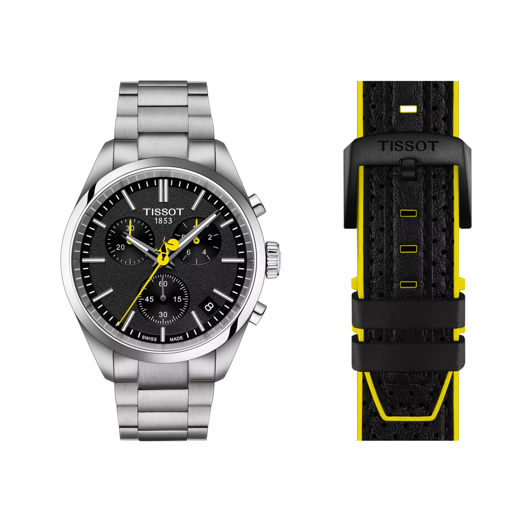 The coloured bicycle shaped second hand pays tribute to the vibrant spirit of the events and elegantly sweeps over an asphalt textured dial. A dedicated caseback engraving reflects your passion for cycling and style. This special edition is delivered with an additional bi-material strap with yellow rubber and black leather.