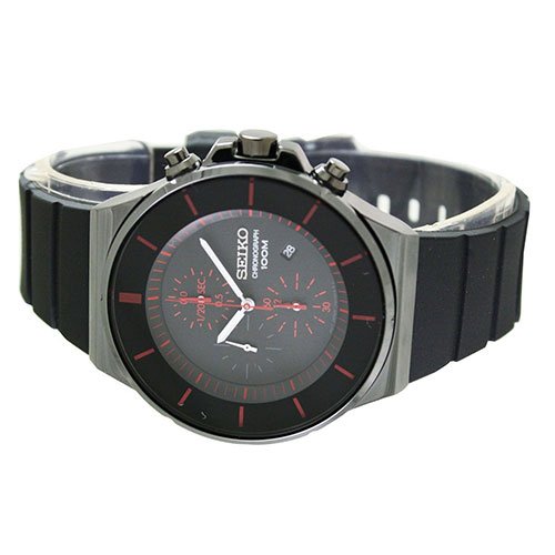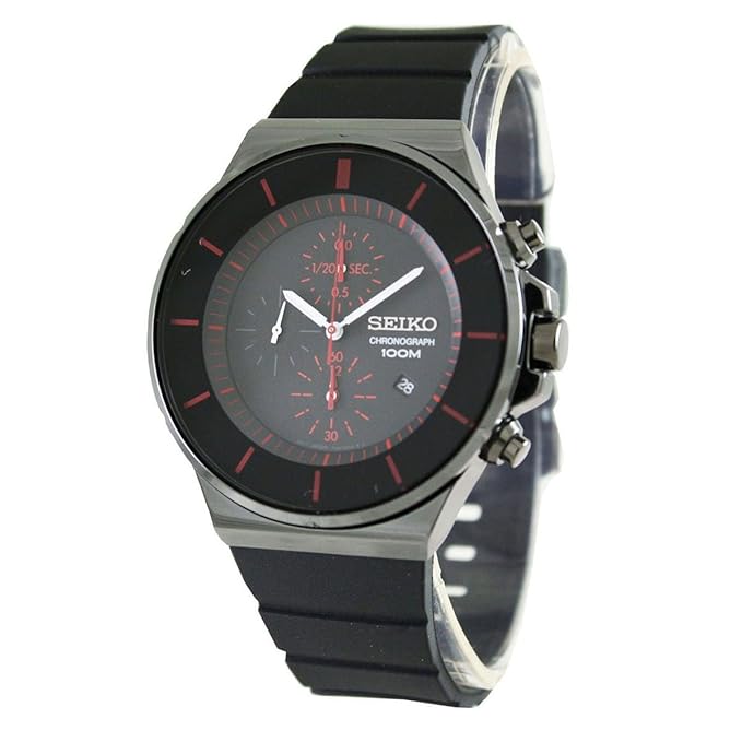 Stainless steel case with a black polyurethane strap. Fixed black PVD bezel. Black dial with luminous hands and red index hour markers. Minute markers around the outer rim. Dial Type: Analog. Luminescent hands and markers. Date display at the 4 o'clock position. Chronograph - three sub-dials displaying: 60 second, a dual 60 minute / 12 hour and 1/20th of a second. Quartz movement. Scratch resistant Hardlex crystal. Solid case back. Case diameter: 44 mm. Round case shape. Tang clasp. Water resistant at 100 meters / 330 feet. Functions: chronograph, date, hour, minute, second. Casual watch style. Seiko Chronograph Black Dial Men's Watch SNDD61.